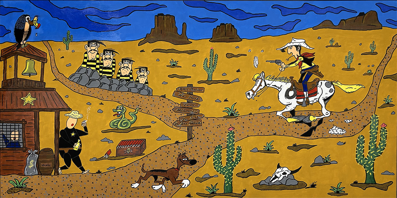 Lucky Luke und die kleinen Dicken„Lucky Luke und die kleinen Dicken“ (Februar 2025)Acryl auf Leinwand, 120 × 60 cmVerfügbar – Preis auf Anfrage